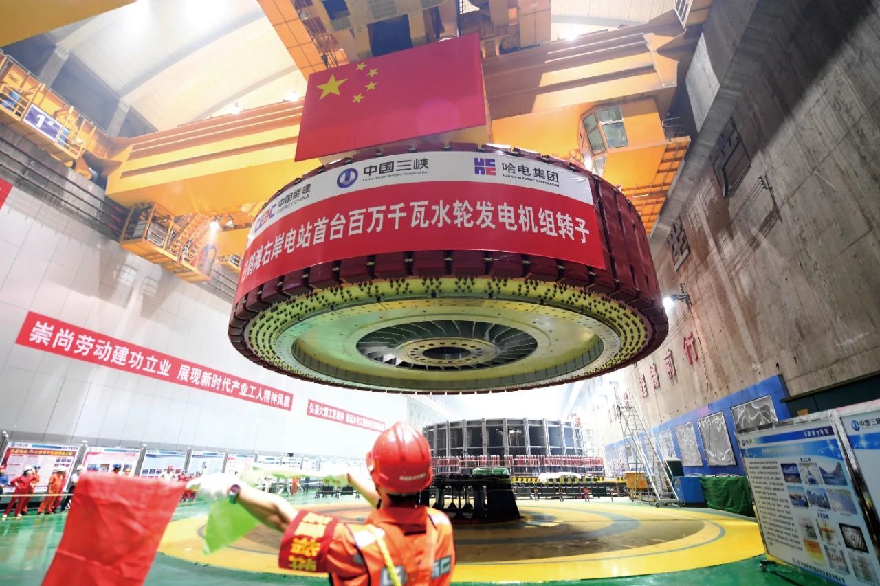 2020年9月9日,電機公司研制的白鶴灘右岸電站首臺全球單機容量最大功率百萬千瓦水輪發(fā)電機組轉子吊裝成功。